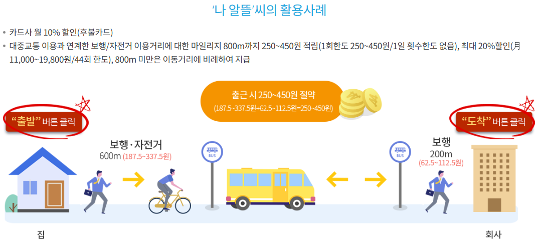 버튼을 누르는 습관만 들이면 매일 700원 이상의 교통비를 절약함과 동시에 걷기 운동 효과도 누릴 수 있는 '알뜰교통카드' 추천드리면서 글 마치겠습니다.