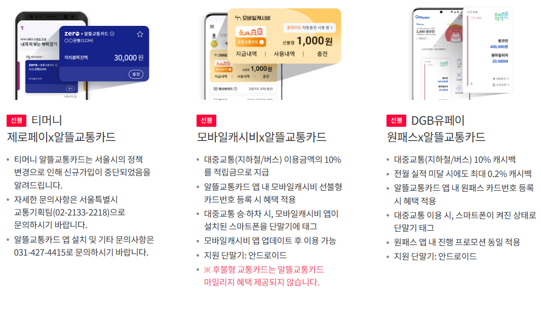 그래서 청소년은 선불 교통카드인 티머니, 캐시비, 유페이 등의 선불교통카드사의 상품을 발급받아 알뜰교통카드의 혜택을 받을 수 있습니다. 현재 티머니 제로페이 알뜰교통카드는 신규가입이 중단되었고 모바일 캐시비와 유페이 원패스는 가입 가능합니다. 지원 단말기는 '안드로이드'만 가능하니 자녀에게 알뜰교통카드를 발급해 주실 부모님이시라면 이 부분을 꼭 참고하셔야 합니다.