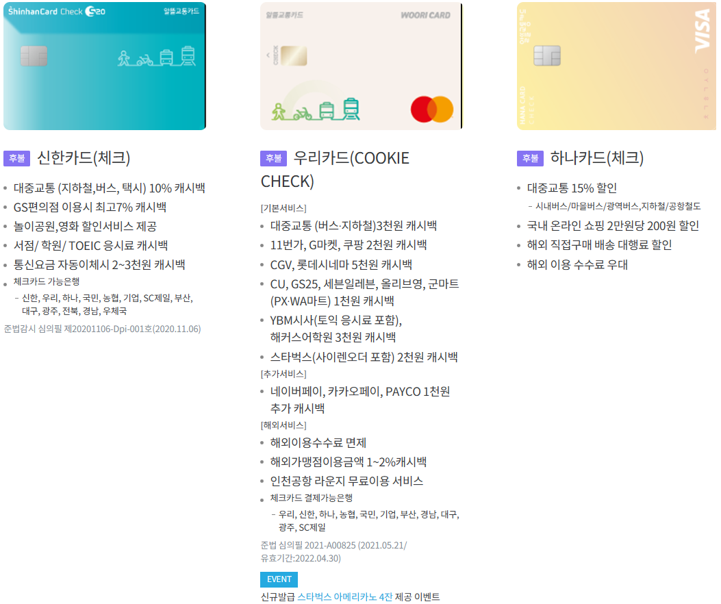 현재 우리카드(쿠키체크)가 가장 혜택이 좋아 보입니다. 쇼핑몰, 편의점, 영화관, 토익, 스타벅스 등 캐시백과 해외이용수수료 면제에 인천공항 라운지까지 무료 이용 가능합니다. 현재 2월 안에 신규 발급 시 스타벅스 아메리카노 4잔까지 제공하고 있습니다. 연회비 없는 카드인데 가입혜택까지 있으니 알뜰교통카드 발급을 고려하신다면 우리카드를 발급하지 않을까 싶습니다.