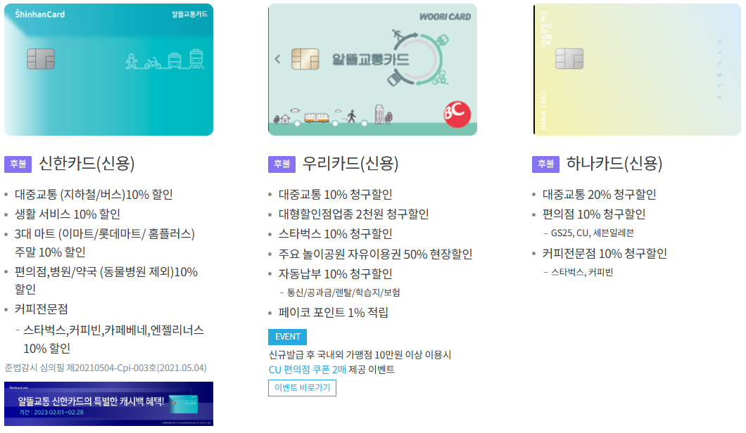 알뜰교통카드 신용카드 중에서는 신한카드 혜택이 가장 좋아보이네요. 대중교통 10% 추가할인에 마트, 편의점, 병원, 약국, 카페까지 할인점의 폭이 넓습니다. 2월 중에 신한 알뜰교통카드 발급 후 5만 원 이상 이용 시 5만 원 캐시백 행사를 진행 중이니 알뜰교통카드를 신용카드로 받으실 분은 혜택을 참고하시면 되겠습니다.